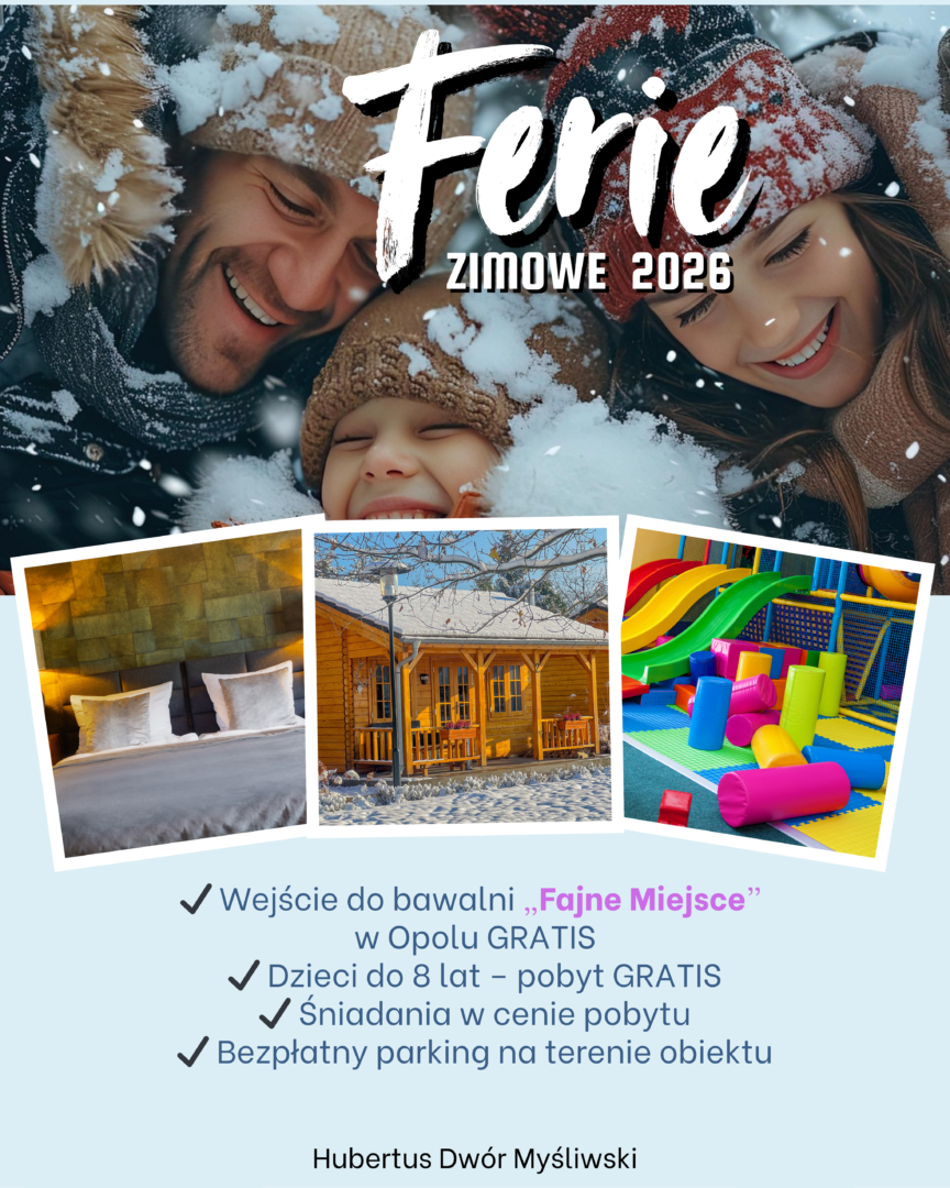 Zapraszamy na rodzinne Ferie Zimowe 2026 do Dworu Myśliwskiego Hubertus – spokojnego miejsca blisko natury, położonego tylko 13 km od Opola. To idealna propozycja dla rodzin z dziećmi, które chcą połączyć wypoczynek, atrakcje i komfortowe warunki pobytu.